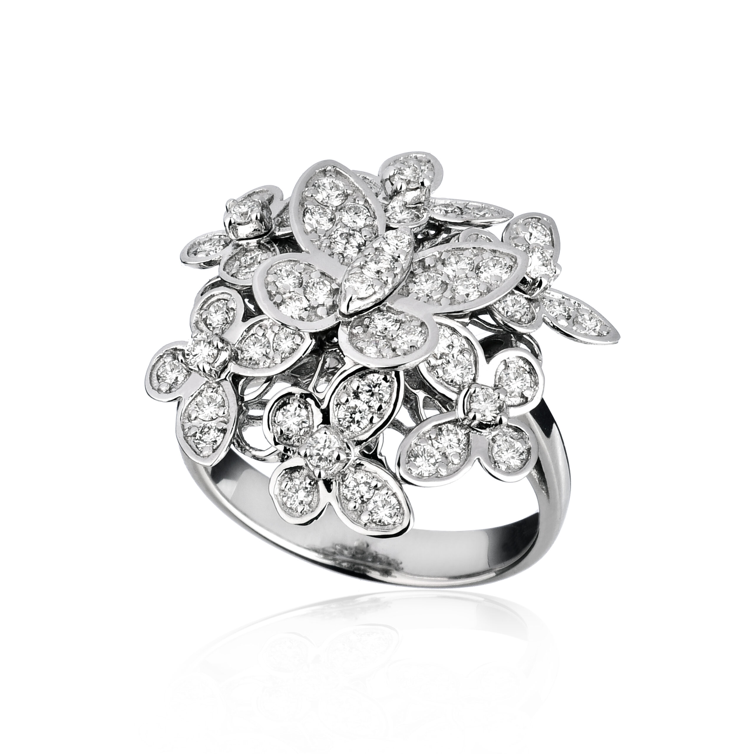 A sophisticated and striking jewel: a dance of butterflies comes to life with pavé-set white diamonds that enhance its brilliance. The butterflies, mobile and gently rotating, add movement and magic to this precious and unique design. An elegant ring, symbol of freedom and transformation.