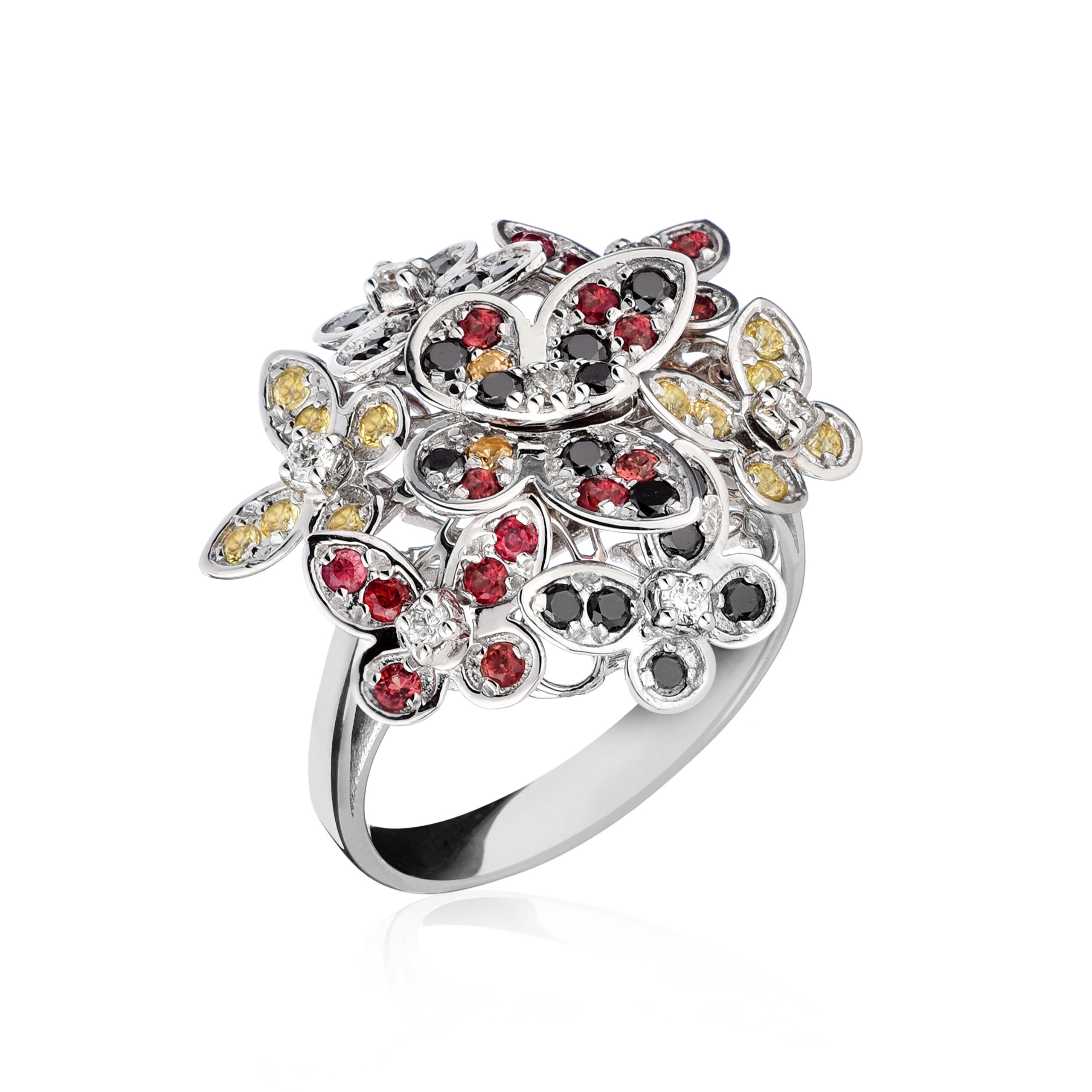 Un anello scenografico e raffinato: un insieme di farfalle prende vita grazie a diamanti bianchi e neri, zaffiri arancio e zaffiri gialli che creano un gioco vivace di luce e colore. Le farfalle, mobili e roteanti, donano movimento e originalità a un design unico e prezioso. Un gioiello elegante, simbolo di energia e trasformazione.