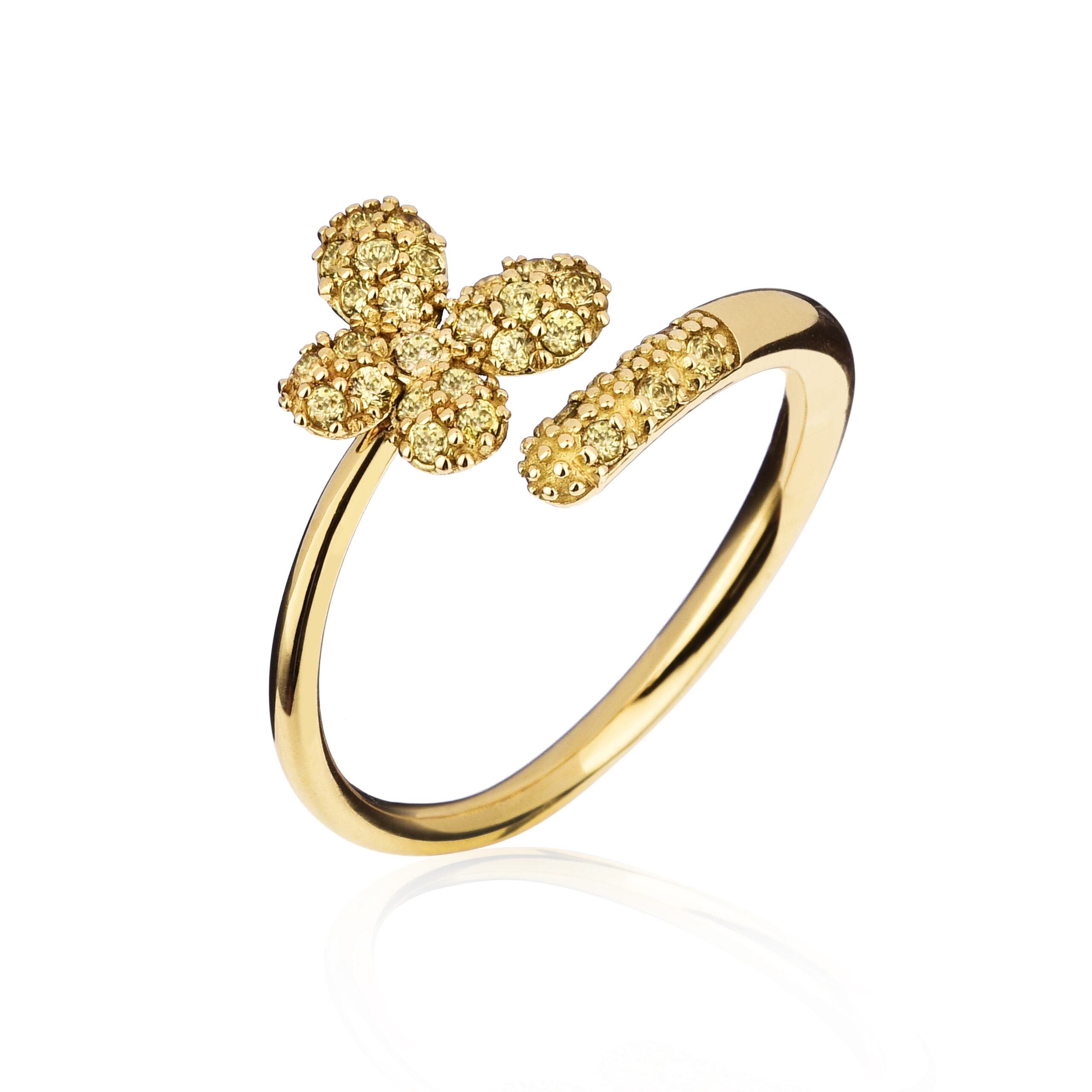 Un gioiello vivace e luminoso: la farfalla, simbolo di leggerezza e trasformazione, si illumina grazie agli zaffiri gialli che donano energia e vitalità al design. Un anello raffinato e originale, capace di catturare lo sguardo con la sua brillantezza unica.