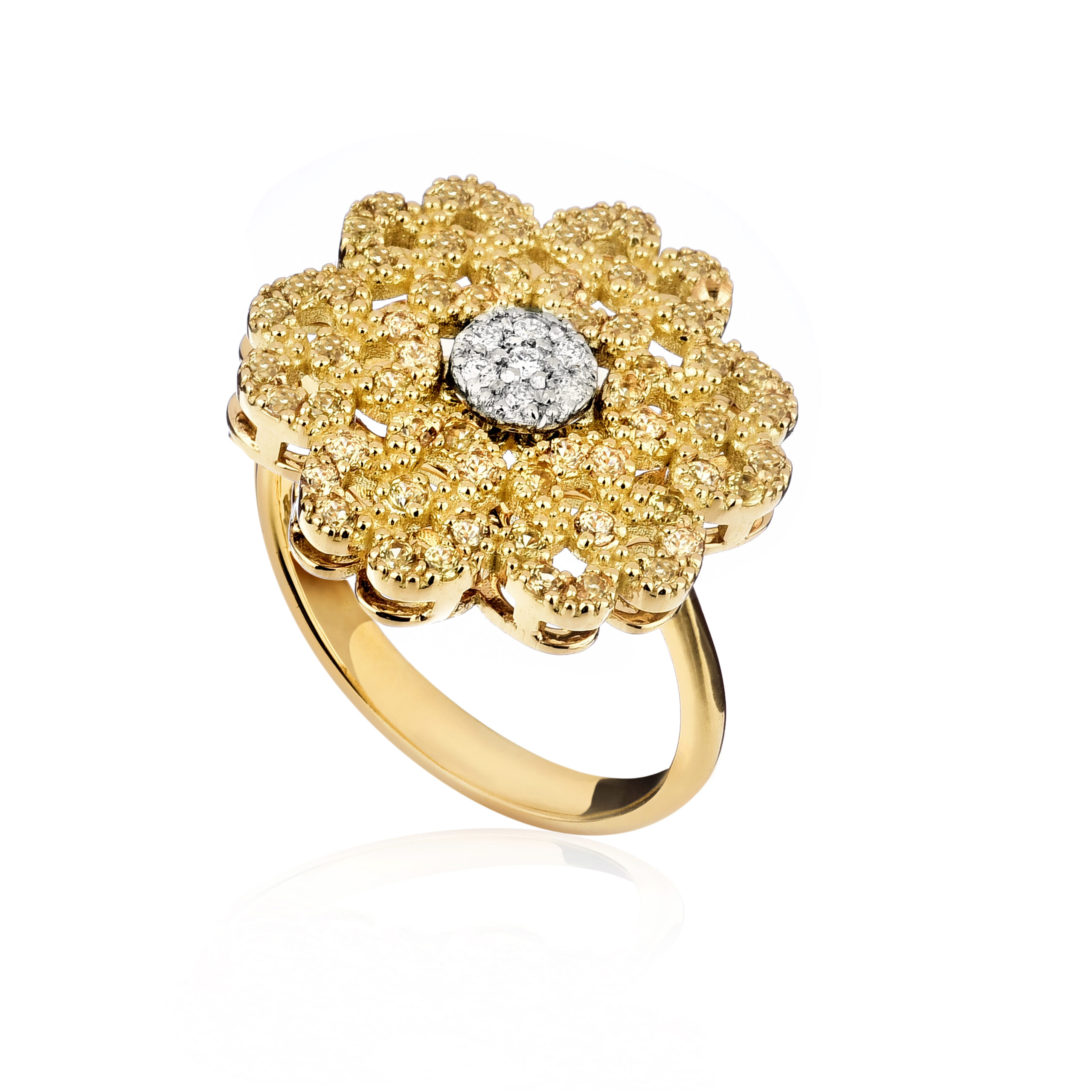 Anello in oro titolo 750‰ con zaffiri gialli e diamanti naturali taglio brillante