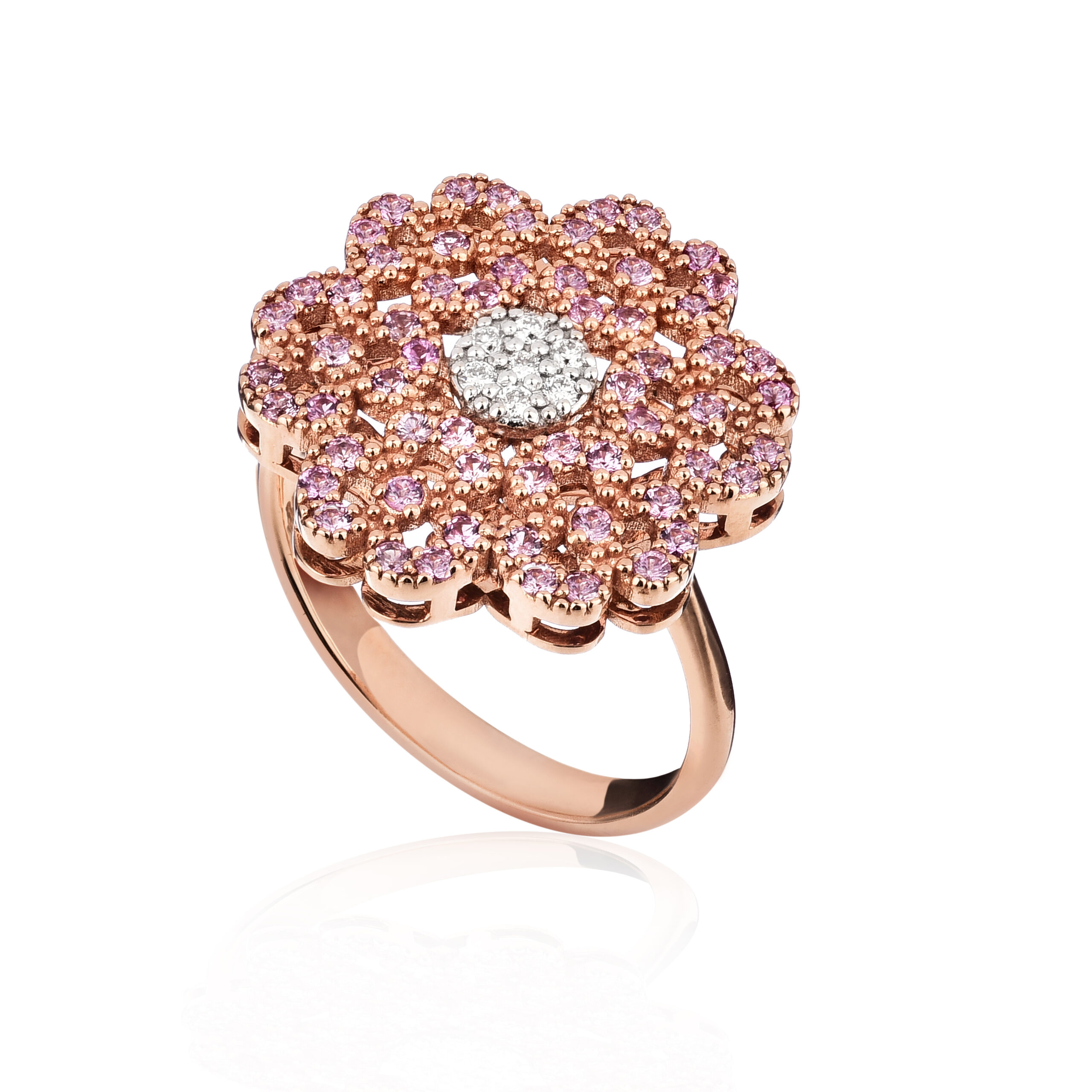 Anello in oro titolo 750‰ con zaffiri rosa e diamanti naturali taglio brillante