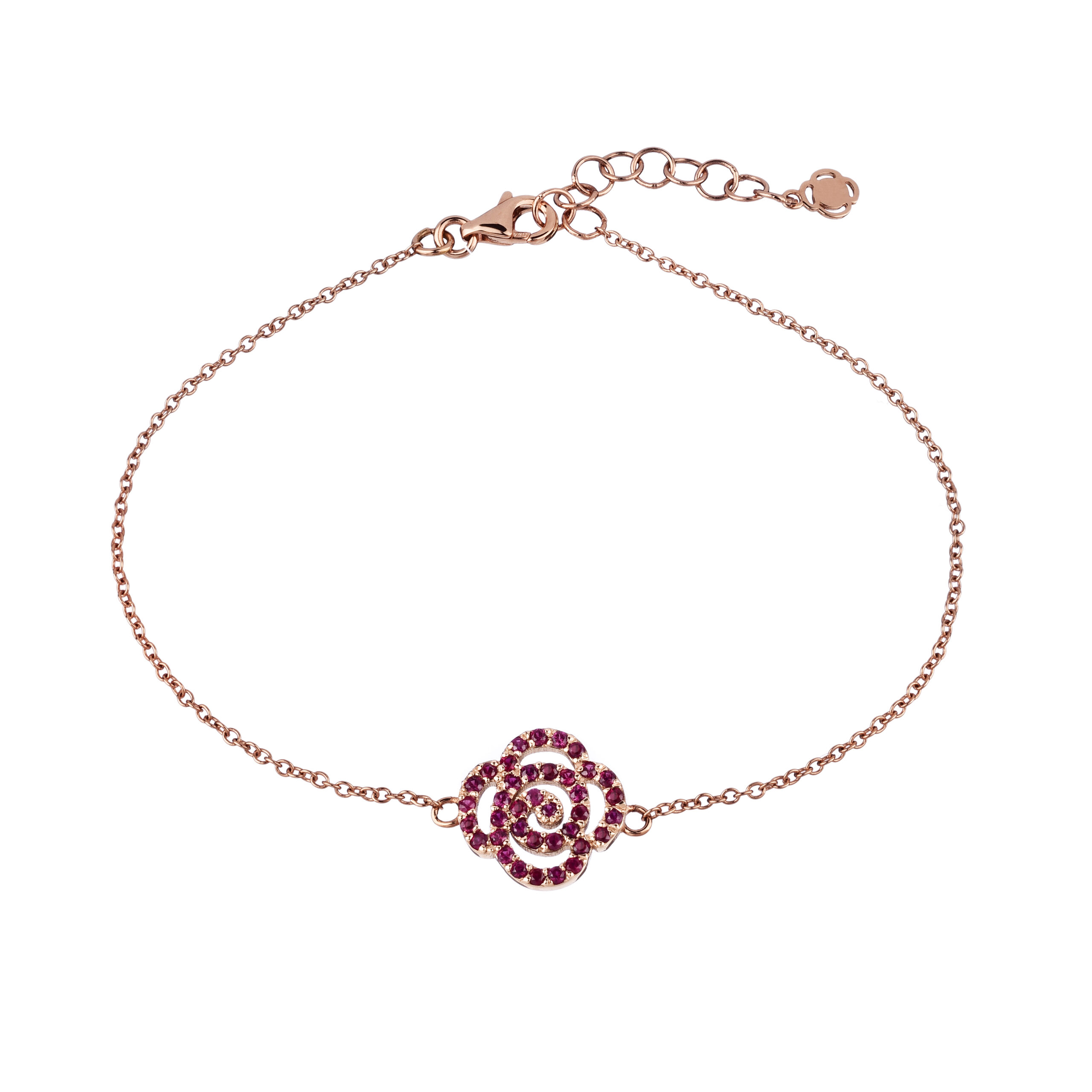 Un motivo floreale ispirato alla Rosa di Taif impreziosisce questo bracciale con la sua luce calda e avvolgente. I rubini delineano i petali con sfumature intense, creando un dettaglio che si accende ad ogni movimento del polso. Un gioiello leggero e raffinato, pensato per chi ama un tocco di colore prezioso e un’eleganza senza tempo.