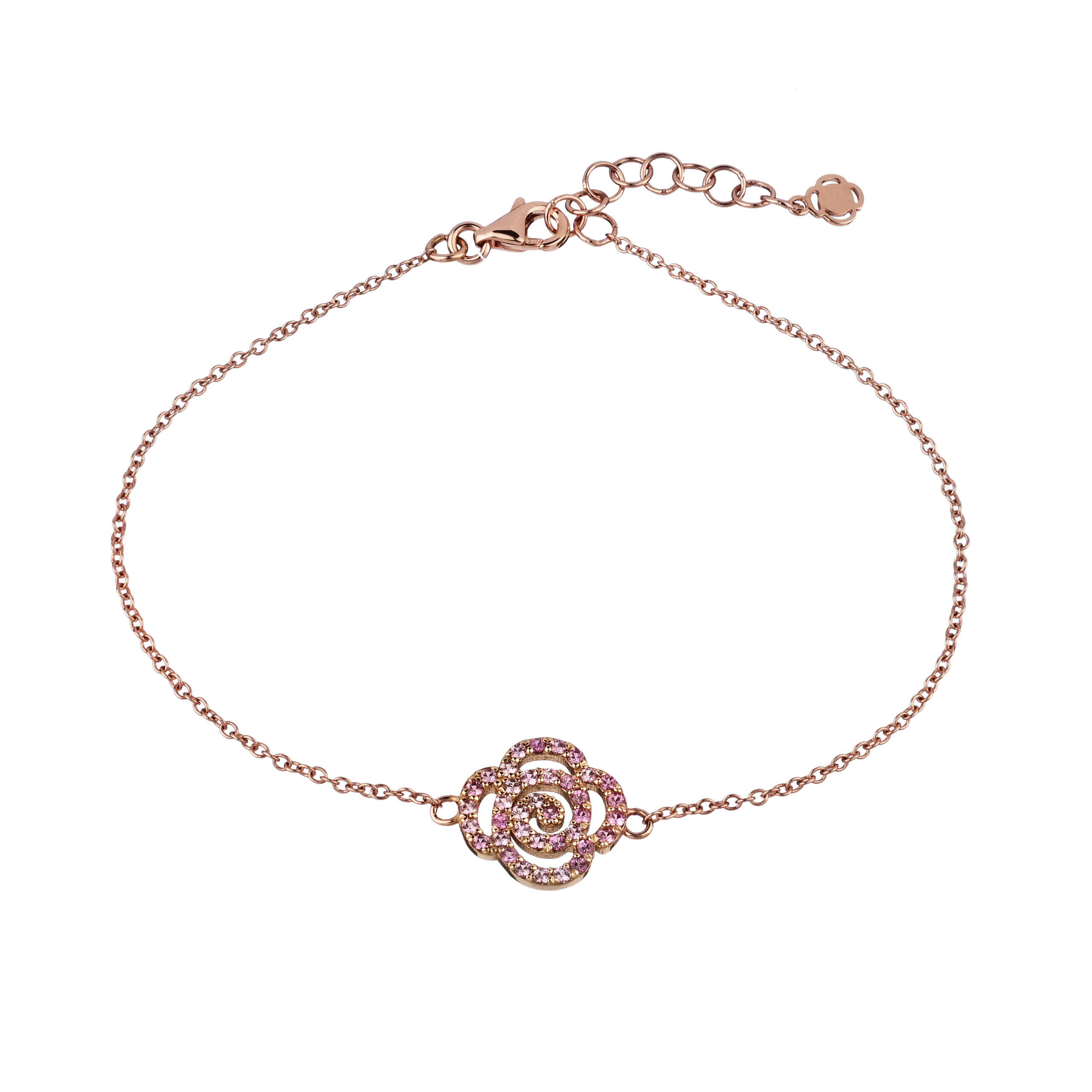 Un motivo floreale ispirato alla Rosa di Taif impreziosisce questo bracciale con la delicatezza delle sue sfumature. Gli zaffiri rosa delineano i petali con una luminosità dolce e sofisticata, creando un dettaglio che si illumina ad ogni movimento del polso. Un gioiello leggero e raffinato, pensato per chi ama un tocco di colore elegante e sempre discreto.