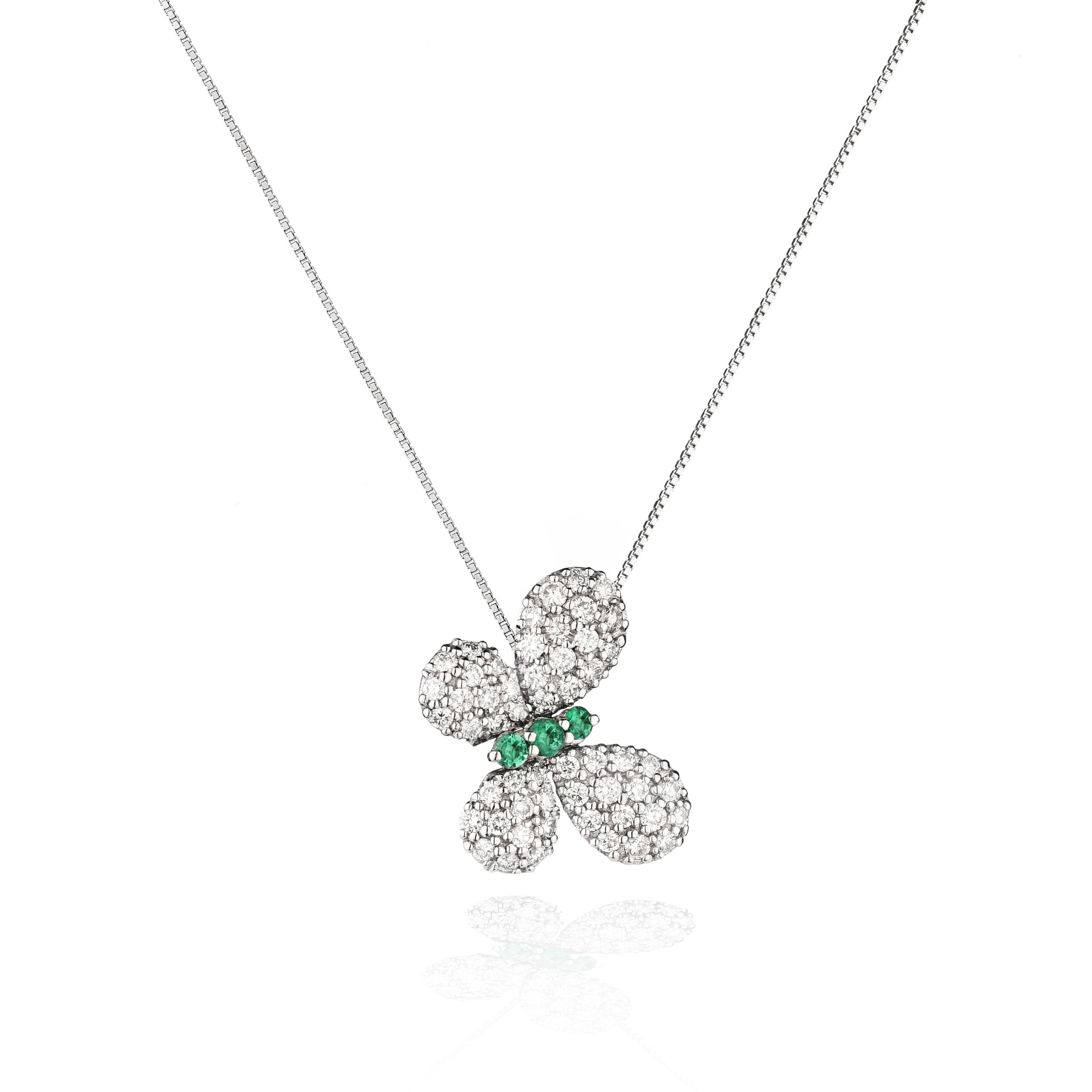 Un’eleganza senza tempo: la farfalla si accende di luce grazie al pavé di diamanti bianchi, arricchita da tre smeraldi che donano freschezza e vitalità al design. Un collier raffinato e prezioso, simbolo di rinascita e armonia con la natura.